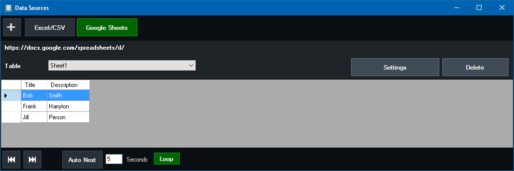 Once a Data Source has been added and assigned to a title, it may contain a number of rows you want to select from, for example a list of speakers