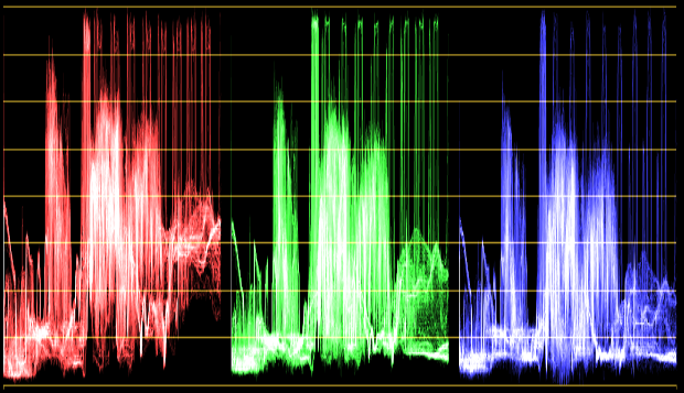 Displays a waveform of the red, green and blue colour channels on top of each other as shown below.