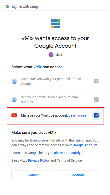 This error will occur if you miss an important step during the login process. To fix, login to YouTube again via vMix. But when you reach the below step make sure you tick the last checkbox for "Manage your YouTube Account". This is required in order for vMix to have the appropriate permissions. Once this box is ticked, the error will be resolved.