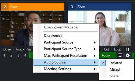 Audio Source: Choose from Isolated, Mixed or Share. Isolated will only have the Zoom participant's audio that is assigned to that specific input. Mixed will have all audio of the entire meeting, this combines multiple participants and is controlled by Zoom. Share will only have the audio from the selected Zoom Input's Screen Share when they are sharing. The use of Mixed is useful if you would like to have only one Zoom audio active and the others turned off.