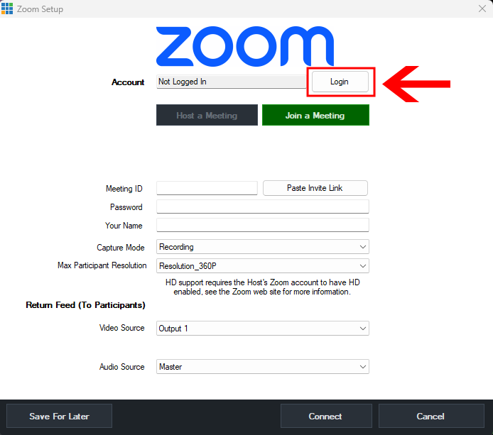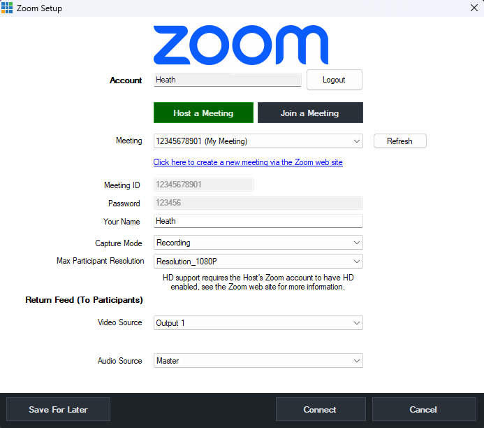 Optionally click Save For Later if you only wish to save the settings but not connect to a meeting at this time.