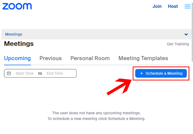 1) Select the Host a Meeting button. Underneath this a dropdown menu will appear which contains any existing scheduled Zoom Meetings you have already created in your Zoom account. You can either select an existing meeting, or click the link below that to Create a new meeting via the Zoom website. Choosing this will launch your account on the Zoom website where you can then select the Schedule a Meeting button. After that fill in the Meeting settings you require and click save. (if you are unsure about any of the meeting setting options, please refer to the Zoom documentation).