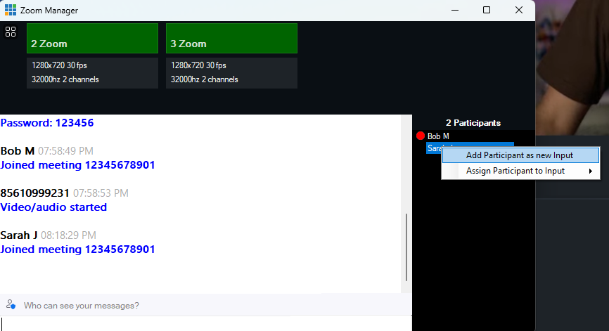We can see another Zoom participant called Sarah has joined. I have only got one zoom input added, so I will need to add another one for Sarah. I can do this either by going to the Add Input button, selecting the Zoom Tab then press OK. Or alternatively, I can also do this from the Zoom Manager window by right clicking the participant's name and selecting Add Participant as new Input. Or alternatively, I can assign them to an existing Zoom input already in my production.