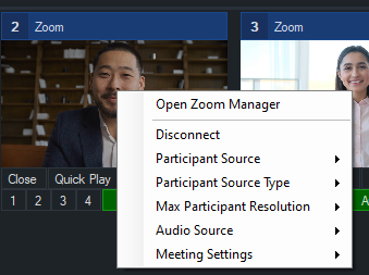 If you have chosen to add a new Zoom input via the Add Input menu, then by default it will still show the first Zoom participant that joined. In order to change this to show a different participant, right click the Zoom Input, navigate to the Participant Source option and then select the participant you wish to assign to this Zoom input.